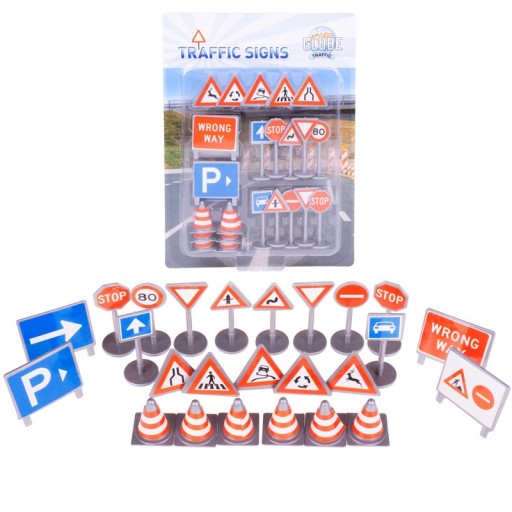 Nie ma się co łudzić! Dzieci powinny znać przepisy ruchu drogowego - te najprostsze, ma się rozumieć! A jak je ich nauczyć? Przez zabawę! Przedstawiamy zestaw 25 znaków drogowych. Jeśli szukasz pomysłu na fajny, rozwijający prezent, to właśnie go znalazłeś. Bawiąc się tymi znakami, maluch może tworzyć własne drogi (np. z klocków) i aranżować różne sytuacje drogowe.
