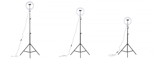 Do lampy w komplecie dodajemy lekki, uniwersalny, płynnie regulowany, dwusekcyjny, stabilny statyw o maksymalnej wysokości 210cm. Po złożeniu można go używać do oświetlania małych obiektów z bliska (minimalna wysokość 66cm). Posiada wygodne zaciski sekcji oraz uniwersalną głowicę mocującą 1/4”. Teleskopowy mechanizm składania zapewnia niewielkie wymiary po złożeniu. Oprócz lamp typu ring statyw może być używany do innego małego i średniego oświetlenia (udźwig do 1,5kg) takiego jak światło stałe, błyskowe, softboxy, lampy halogenowe.