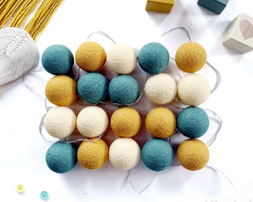 - Kule do lampek cotton balls wykonywane są ręcznie, z naturalnych - bawełnianych nici, co nadaje im niepowtarzalny charakter. Staranność wykonania, wysoka jakość użytych materiałów, oraz gęsty splot nici sprawiają, że nasze kule nie potrzebują wewnątrz plastikowego szkieletu. Zastosowana przez nas technologia produkcji sprawia, że nasze lampki cotton balls są o wiele bardziej estetyczne niż ich tańsze odpowiedniki.
