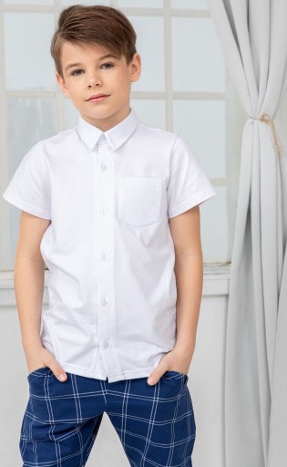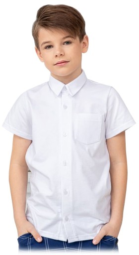 Koszula z krótkim rękawem, śnieżnobiała, wizytowa, klasyczny fason, z kieszonką. Zapinana na guziki.