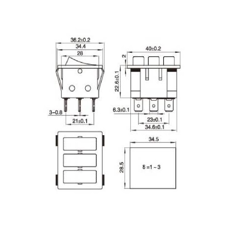 Potrójny przełącznik klawiszowy 2-pozycyjny (ON-OFF) z 9 pinami. Przełącznik stanowią 3 niezależne obwody elektryczne w jednej obudowie. W każdym obwodzie 2 piny wykorzystywane są do zamykania/otwierania obwodu, natomiast trzeci pin służy do podłączenia podświetlenia przełącznika.