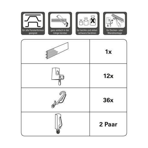 W zestawie z szyną znajdują się: agrafki ze ślizgiem, uchwyty do montowania na ścianie lub suficie, zakończenia szyny.