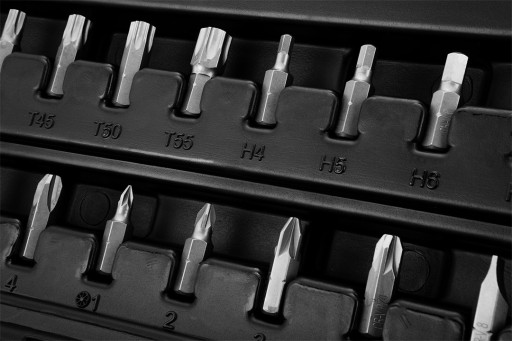 - Końcówki wkrętakowe w zestawie: bity 5/16" 25 szt.: TX20, TX25, TX30, TX40, TX45, TX50, TX55, HEX4, HEX5, HEX6, HEX8, HEX10, HEX12, HEX14, PH1, PH2, PH3, PH4, PZ1, PZ2, PZ3, PZ4, SL8, SL10, SL12