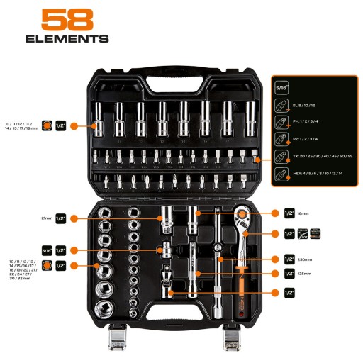 Klucze nasadowe 1/2”, zestaw 58 sztuk, CRV, 10-042 marki NEO to niezbędny pakiet narzędzi w rozmiarze 1/2”, umieszczonych w wygodnej walizce z tworzywa sztucznego. W jego skład wchodzi 58 elementów wykonanych z wysokiej jakości stali chromowo-wanadowej. Zestaw zawiera pakiet siedemnastu nasadek sześciokątnych w rozmiarach: 10, 11, 12, 13, 14, 15, 16, 17, 18 19, 20, 21, 22, 24, 27, 30, 32 mm, pakiet ośmiu sztuk nasadek sześciokątnych długich 1/2” w rozmiarach 10, 11, 12, 13, 14, 15, 17, 19 mm, pakiet dwudziestu pięciu bitów 5/16” - T20, T25, T30, T40, T45, T50, T55, H4, H5, H6, H8, H10, H12, H14, PH1, PH2, PH3, PH4, PZ1, PZ2, PZ3, PZ4, FD8, FD10, FD12, grzechotkę 1/2” – ulepszona wersja z 90 zębami oraz precyzyjnym mechanizmem zapadkowym, poręczną przedłużkę 125 i 250 mm, przegub uniwersalny 1/2”, redukcję 1/2”, adapter do bitów 1/2” – 5/16” oraz 2x nasadka do świec 1/2” 16, 21 mm. Jakość i niezawodność produktów potwierdza 25-letnia gwarancja. Marka NEO spełnia oczekiwania profesjonalistów.