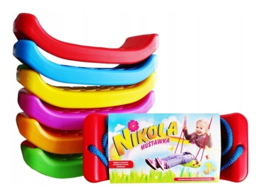 Plastikowa huśtawka w formie podłużnej deseczki. Huśtawka przeznaczona jest do użytku domowego, zarówno na zewnątrz jak i wewnątrz domu.