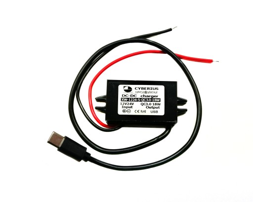 Przewód-przetwornica napięcia QC3,0 18W z 8 - 20 V na 5 V - USB-C, o wydajności prądowej do 3,6A w zależności od dopuszczalnych progowych parametrów urządzeń zasilanych. Na wyjściu posiada gniazdo systemu USB-C na przewodzie o długości 30 cm długości od przetwornicy do gniazda USB. Przewód zasilający, biegnący od źródła napięcia w samochodzie do przetwornicy wynosi około 13 cm.