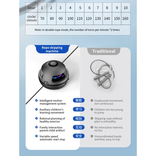 Zdalna regulacja: istnieje regulacja prędkości, kontrolowana za pomocą pilota, aby spełnić różne potrzeby. 1-4 bieg, odpowiedni dla dzieci powyżej 3 lat dla początkujących; Poziom 5-8, odpowiedni do szkolenia egzaminacyjnego dla dorosłych spalających tłuszcz; 9-10 biegów, odpowiednie do profesjonalnego treningu w skakaniu.