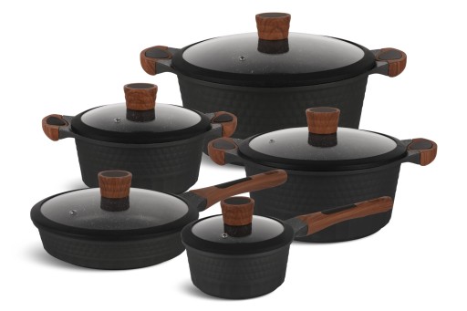 Zestaw wykonany z najwyższej jakości aluminium pokrytego powłoką ceramiczno-marmurkowa, które jest lekkie a jednocześnie odporne na zarysowania i odkształcenia.