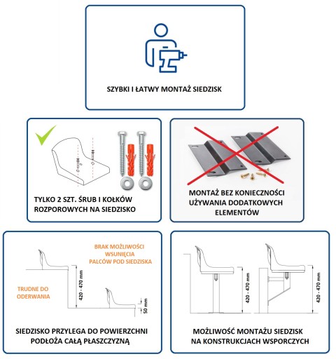 - siedziska stadionowe mogą być także mocowane do konstrukcji metalowych trybuny stadionowych lub samodzielnych konstrukcji wsporczych - stojących lub wiszących,