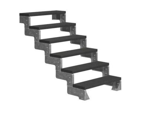 Zestaw składa się z konstrukcji wykonanej z ocynkowanej stali, oraz 6 stopni z antracytowego Trimaxu®. Trimax® jest tworzywem sztucznym wzmocnionym włóknem szklanym. Szerokość stopni to 80 cm, dostępne są również szersze - 100 cm, oraz balustrady do schodów. Konstrukcja składa się z górnej i dolnej stopy mocującej konstrukcji, umożliwiają one mocowanie schodów do podłoża i ściany.
