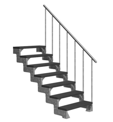 Zestaw składa się z konstrukcji wykonanej z ocynkowanej stali, oraz 7 stopni z antracytowego Trimaxu®. Trimax® jest tworzywem sztucznym wzmocnionym włóknem szklanym. Szerokość stopni to 100 cm, dostępne są również 80 cm, oraz balustrady do schodów. Konstrukcja składa się z górnej i dolnej stopy mocującej konstrukcji, umożliwiają one mocowanie schodów do podłoża i ściany.