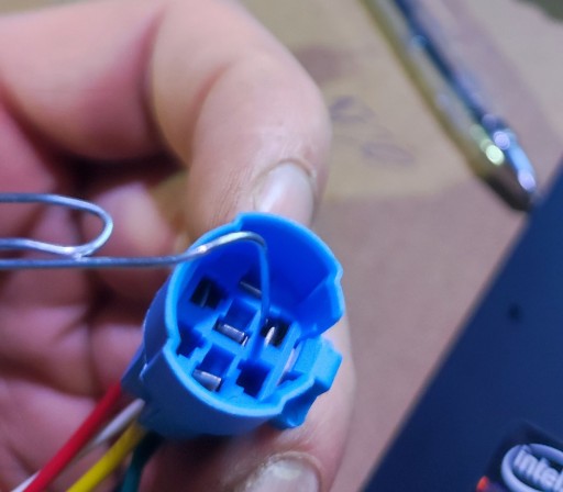 Może się zdarzyć że przewody w kostce od podświetlenia nie będą pasować na piny w przycisku, należy kostkę obrócić ( zatrzask z kostki nie będzie wtedy zaczepiał o wypust przycisku co raczej nie powinno stanowić problemu bo i tak kostka "mocno siedzi"). Można również przełożyć piny zwalniając je z kostki wkładając drucik jak na foto obok