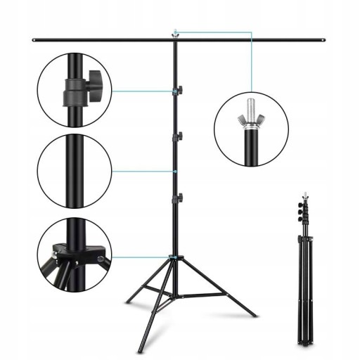Teleskopowy rozkładany statyw można regulować w zakresie od 70 do 200cm natomiast górna belka złożona jest z 2 sekcji o łącznej długości 1,5 metra