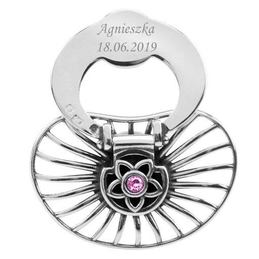 Smoczek Srebrny różowy kamyk na Chrzest Grawer