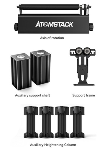 ATOMSTACK R3 PRO Laserowy wałek obrotowy Grawer laserowy Wałek obrotowy osi Y z obrotem o 360 ° do grawerowania laserowego Puszki na przedmioty cylindryczne (4 x pomocnicze kolumny podwyższające+2 x pomocniczy wałek pomocniczy+1 x rama nośna)