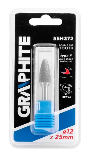 Frez do metalu GRAPHITE (nr ref. 55H372) typu F (ostrołukowy zaokrąglony) i rozmiarze 12 x 25 mm to narzędzie przeznaczone do szlifierki prostej służące do skrawania lub piłowania obrabianej powierzchni. Przeznaczony do prac w materiałach takich jak metal, aluminium i tworzywa sztuczne. Zastosowanie węglika spiekanego sprawia, że narzędzie ma wysoką twardość oraz odporność na zużycie ścierne. Frez ten cechuje się podwójnymi nacięciami, które pozwalają na łatwe usuwanie naddatków w obrabianych materiałach.