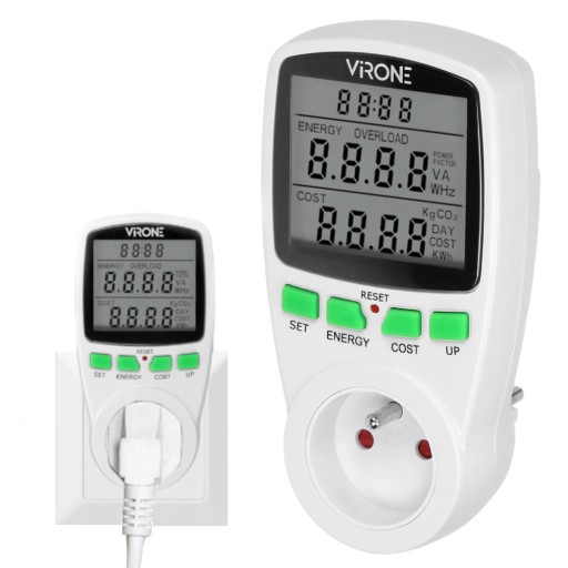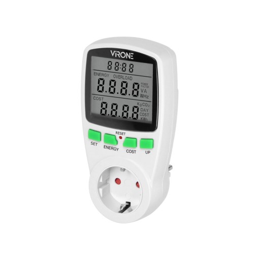 Jednotaryfowy watomierz, kalkulator energii z wyświetlaczem LCD, jedna taryfa, wbudowany akumulator, wersja Schuko