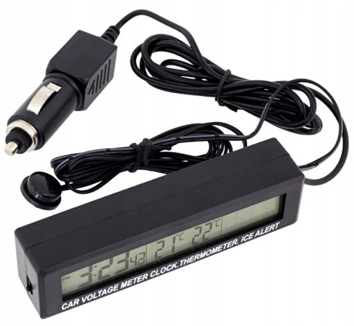 Elektroniczny termometr samochodowy z zegarkiem oraz pomiarem stopnia naładowania akumulatora.