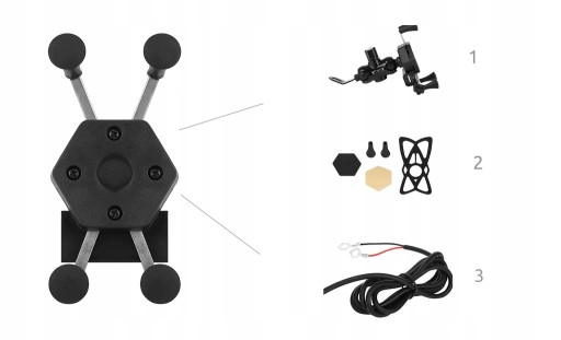 Uchwyt montowany jest do kierownicy lub ramy motocykla, ładowarkę podłączamy bezpośrednio do akumulatora za pomocą przewodów oczkowych. Produkt został skonstruowany w podwójnej konstrukcji kulkowej, dzięki czemu jest możliwy obrót o 360 stopni (3D) pozwalający na dokładne i precyzyjne dopasowanie widoczności. Pasuje do każdego telefonu oraz nawigacji o maksymalnej szerokości 85mm; możemy go zamontować na motorze, skuterze, quadzie itp. Konstrukcja uchwytu została wykonana z aluminium, co gwarantuje wieloletni okres użytkowania.