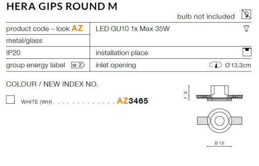 Oprawa do wbudowania Hera Gips M AZ3465 AZzardo. Oprawa do wbudowania Hera Gips S AZ3465 - AZzardo. Lampa wpuszczana gipsowa idealna do oświetlenia pokoi i korytarzy domowych oraz w obiektach komercyjnych. Trzonek GU10 - Żarówka LED.