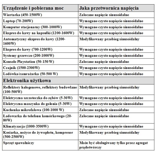 Po wyborze napięcia należy zdecydować, jaka moc przetwornicy będzie odpowiednia. Ma ona kluczowy aspekt, gdyż informuje nas ile i jakie urządzenia jest w stanie zaopatrzyć w prąd. Jeśli chcemy podłączyć do inwertera wybrane urządzenie, musimy sprawdzić na tabliczce znamionowej, jaką pobiera moc (w przypadku chęci podłączenia większej liczby urządzeń, moce należy zsumować). Pobierana przez Twoje urządzenie moc nie powinna przekraczać 85% mocy znamionowej przetwornicy! Przykładowo dla laptopa pobierającego moc 100W i grzałki pobierającej 300W odpowiednią przetwornicą będzie ta o mocy 500W i większej.