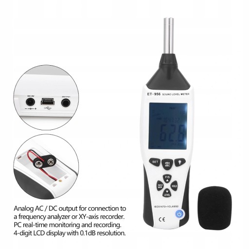 Materiał: ABS Obowiązująca norma IEC61672-1 Kategoria 2 Dokładność ± 1,4 decybeli Zakres częstotliwości 31,5 Hz - 8 kHz Zakres dynamiki 50 decybeli Zakres poziomu pomiarowego Niska częstotliwość: 30 dB-80 dB Średnia: 50 dB-100 dB Wysoka: 80 dB-130 dB Zakres automatyczny: 30 dB-130 dB Częstotliwość Ważenie czasu AC Ważenie szybkiego 125ms; Wolny (1 s) Mikrofon Mikrofon elektretowy pojemnościowy 1/2 cala Maksymalne podtrzymanie Maksymalne Minimalne zatrzymanie Minimalne utrzymanie: Funkcja alarmu zatrzymania danych Gdy wejście przekracza górną granicę zakresu, wyświetla się „OVER”. Gdy wartość wejściowa jest mniejsza niż dolna granica zakresu, wyświetla się „PONIŻEJ”. Wyjście analogowe Wyjście AC / DC gniazda słuchawkowego, AC = 1Vrms, DC = 10mV / dB Rejestracja danych PC Monitorowanie i nagrywanie w czasie rzeczywistym Automatyczne wyłączanie Miernik wyłącza się automatycznie po około 30 minutach. Nieaktywny przez 15 minut. Zasilanie 1 x bateria 9 V (006P lub IEC 6F22 lub NEDA 1604) (bez baterii) Żywotność baterii co najmniej 30 godzin Warunki pracy -20 ° C -60 ° C; 10% RH-90% RH Warunki przechowywania -20 ° C -60 ° C; 10% RH-75% RH