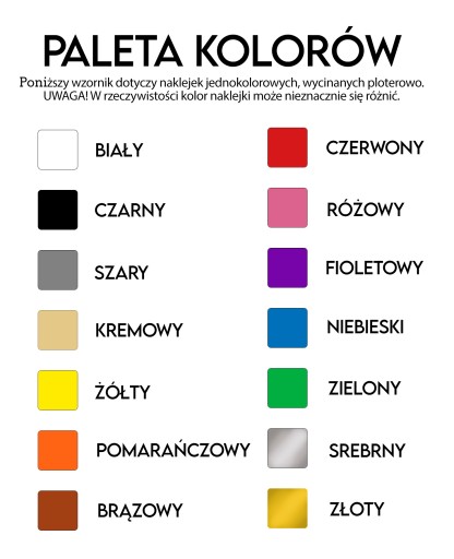 Dostępne kolory: czarny, biały, niebieski, zielony, żółty, różowy, fioletowy, złoty, szary, srebrny, brązowy, kremowy, czerwony, pomarańczowy.