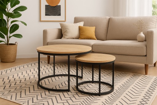 - Praktyczne dwa stoliki ze stalową ramą do salonu, pokoju czy sypialni.