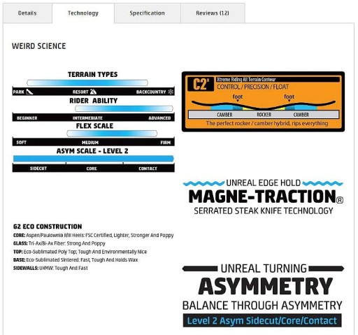 kształt: C2x Contour – krótszy, bardziej agresywny bananowy rocker połączony z camberem, który lepiej leży pod stopą. Wyjątkowo mocne czubek i pięta zapewniają moc, pop, precyzję i stabilność w połączeniu ze średnim naciskiem między stopami do carvingu, trzymania krawędzi na lodzie i pływania w puchu