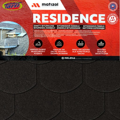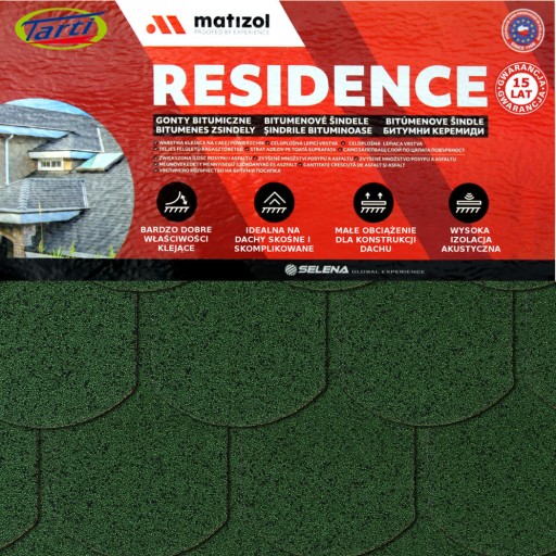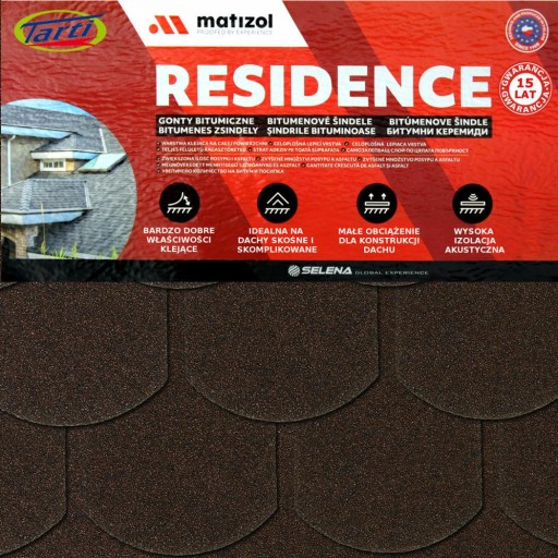 MATIZIOL RESIDENCE to trwałe i wysoce szczelne pokrycie dachowe dedykowane na dachy domów jedno i wielorodzinnych. Dzięki zastosowaniu wysokiej jakości bitumu oraz jego zwiększonej ilości w połączeniu z osnową z welonu szklanego gwarantują 15 lat trwałości. Warstwa klejąca na całej spodniej stronie brytów gontu ułatwia i przyspiesza ich instalację.