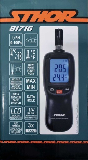 Czujnik kontroluje zarówno wilgotność względną jak i temperaturę. Na podstawie tych wskazań mikroprocesor potrafi obliczyć punkt rosy oraz tzw. temperaturę mokrego termometru. Prosta obsługa, duże cyfry na wyświetlaczu, szereg funkcji ułatwiających pracę oraz wyprofilowana, idealnie wpasowująca się w rękę obudowa sprawiają, że praca tym miernikiem jest łatwa i przyjemna.