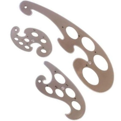 Zestaw krzywików używanych podczas wykonywania rysunków technicznych do wykreślania linii krzywych w szkole. Trzy krzywiki o różnej wielkości 31 x 9 cm, 17 x 7,5 cm, 13,5 x 7 cm. Wykonane z przezroczystego, dymionego tworzywa.