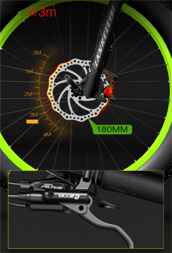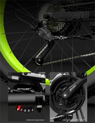 Zawieszenie z podwójną sprężyną olejową i blokowany przedni widelec zapewniają kierowcy większy komfort podczas kolizji. Duże dziury i błotniste drogi o średnicy koła 26*4.O cali mogą z łatwością pokonać próg zwalniający. Opona ma szerokość do 10 cm, posiada funkcje antypoślizgowe i antywibracyjne oraz ma większą rozpiętość. Większy, szybszy i mniej wysiłku.