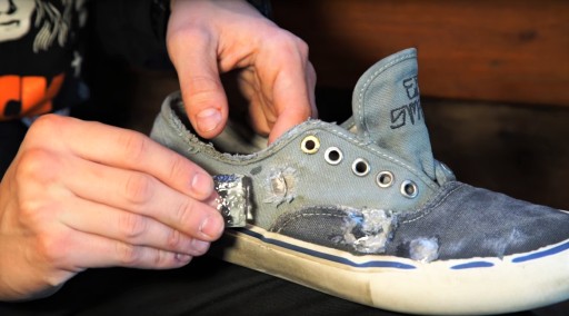 NOWE BUTY nakładać Shoe-Goo cienkimi warstwami i wygładzać równo z powierzchnią. Ogromne kulki wyschniętego kleju z pewnością nie pomogą ci, gdy próbujesz nauczyć się tricków.