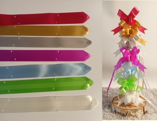- Ozdobna kokarda samo ściągająca - kolor do wyboru z fotografii na dole aukcji. Aby zyskać efekt kokardy, wystarczy pociągnąć wewnętrzne paski.