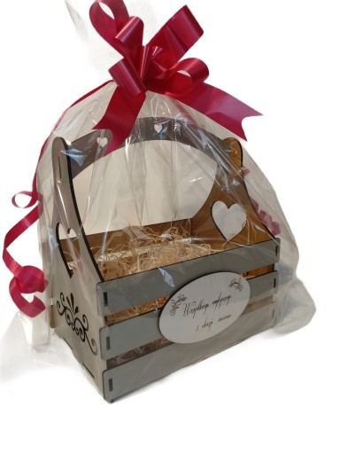 Pusty kosz prezentowy w formie praktycznej i zarazem bogato zdobionej skrzynki z dedykacją, wypełnieniem z wełny drzewnej oraz celofanem i ozdobną kokardą, to piękny pomysł na zapakowanie prezentu dla bliskiej osoby.