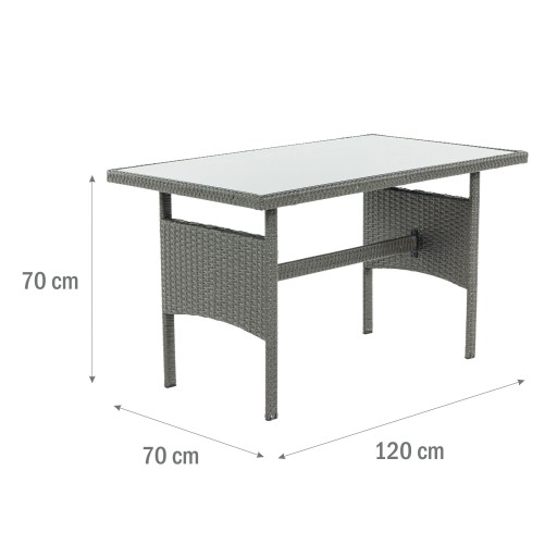 - stelaż stal malowana proszkowo, oplot technorattan, poduszka – 100% poliester, blat stołu – szkło hartowane o gr. 5 mm