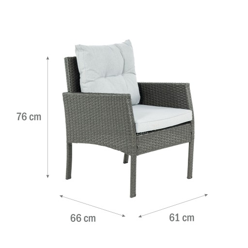 Komplet MEVEN został wykonany z modnego i trwałego technorattanu. Stalowy, malowany proszkowo, stelaż zastosowany w elementach zestawu sprawia, że meble są bardzo wytrzymałe. Wygodę zapewniają poliestrowe poduchy, a więc wypoczynek jest przyjemny i komfortowy.