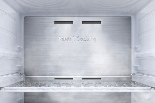 - Metal Cooling Metalowe wykończenie tylnej ścianki zmniejsza utratę zimnego powietrza podczas otwierania drzwi lodówki