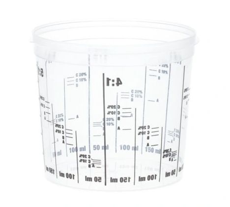 Pojemniki do mieszania lakieru wykonane są z przeźroczystego i bezpiecznego materiału, który charakteryzuje się wysoka trwałością. Są łatwe do opróżniania, co przyczynia się do oszczędności materiału. Nadrukowana na ich powierzchni skala ułatwia dokładne odmierzanie. Wygodne w użyciu i przechowywaniu.