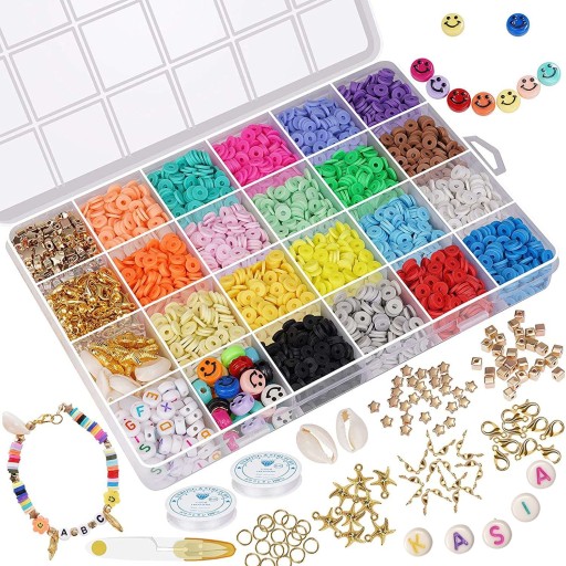 W zestawie znajdziemy koraliki drobne w 19 kolorach seeds 6mm, kolorowe buźki, literki, zawieszki w kształcie rozgwiazdy i muszelki, gumka silikonowa na szpulce, nożyczki, ogniwa, zapięcia, kolczyki oraz złote gwiazdki i kwadraciki.