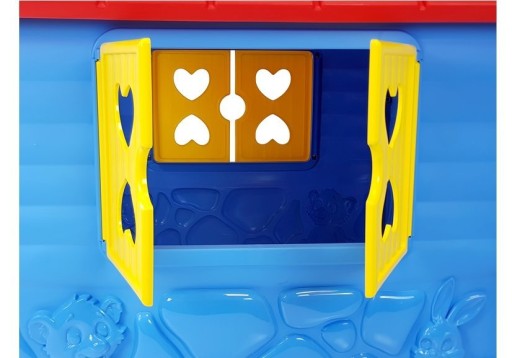 Każda ścianka domku przedstawia motywy różnych zwierzątek : kotka, pieska, czy króliczka, które przyciągają uwagę dziecka. Dom wygląda bardzo realistycznie - ma dach pokryty ''dachówką'' oraz ''elewację z deski''. Domek posiada otwierane okiennice oraz drzwi wejściowe, na których znajduje się skrzynka na listy (otwór w ścianie domu) oraz miejsce na klucz. Dziecko może poczuć się jak w prawdziwym domu! Natomiast z tyłu znajduję się okiennica z kratką, a poniżej dodatkowe wyjście z domu - w formie mniejszego otworu z tyłu - dzieci uwielbiają ten rodzaj zabawy.