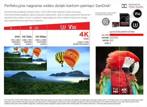 Szybkość klasy UHS-I Speed Class U3 umożliwia wysokiej jakości nagrania Full HD oraz Ultra 4K.
