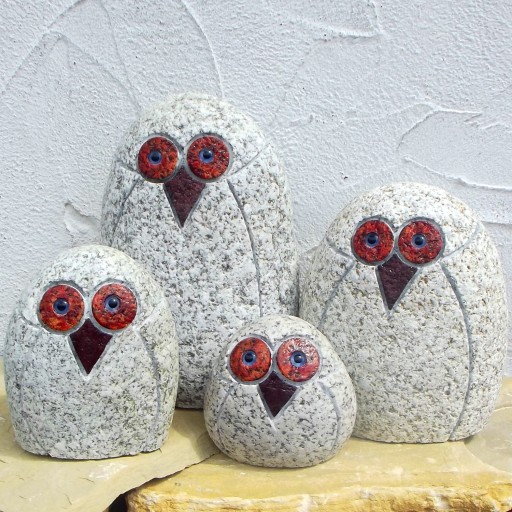 Zestaw czterech dopasowanych do siebie sów wykonanych z naturalnego kamienia granitu. Figurki są odporne na warunki atmosferyczne, oczy sów są ze szkła,. Doskonała dekoracja do ogrodu domku czy na taras. Każdy zestaw jest troszkę inny ponieważ wykonany jest z naturalnych kamieni otoczaków.