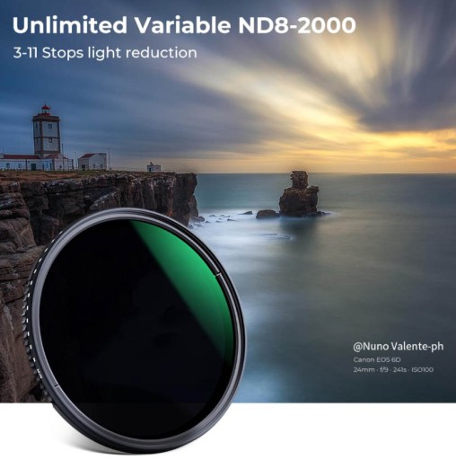 ND8-ND2000: Wykonane z najwyższej jakości szkła Japan Optics, Pierścień obrotowy pomiędzy ND8-2000, regulowany od 3 do 11 stopni, zmniejsza ilość światła bez wpływu na równowagę kolorów.