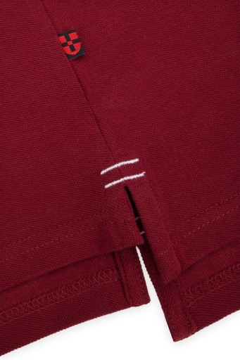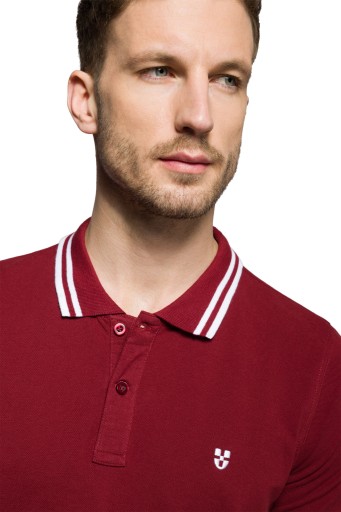 Bordowa, męska polówka Próchnik z białymi borderami na rękawkach i kołnierzyku. Uszyta z bawełnianej piki – przewiewnego i oddychającego materiału. Polówka posiada dwa rozcięcia na bokach, zapięcie na dwa guziki oraz wyhaftowany na lewej piersi sygnet marki Próchnik.