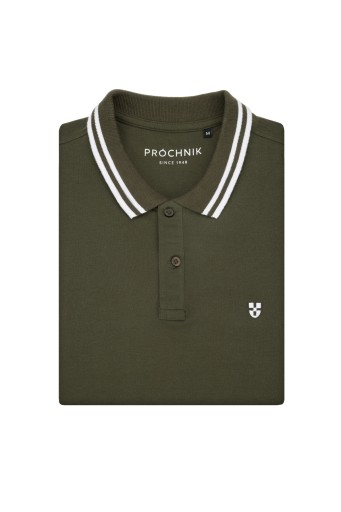 Ciemnozielona, męska polówka Próchnik z jasnymi borderami na rękawkach i kołnierzyku. Uszyta z bawełnianej piki – przewiewnego i oddychającego materiału. Polówka posiada dwa rozcięcia na bokach, zapięcie na dwa guziki oraz wyhaftowany na lewej piersi sygnet marki Próchnik.
