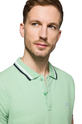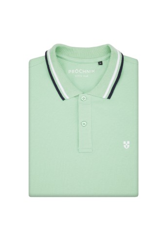 Jasnozielona, męska koszulka polo Próchnik na krótki rękaw, wykonana w 100% z bawełny. Polówka posiada kolorowe bordery na rękawkach i kołnierzyku, dwa rozcięcia na bokach, zapięcie na dwa guziki oraz wyhaftowany na lewej piersi sygnet marki Próchnik.