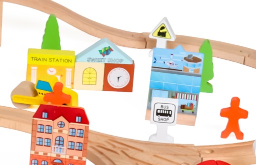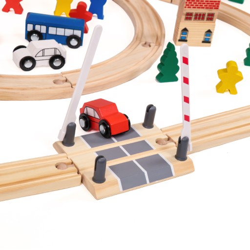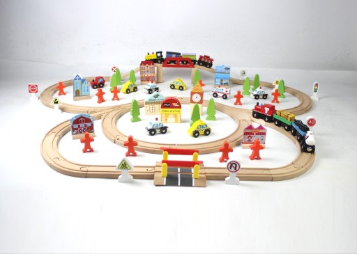 Drewniana kolejka miasteczko to zestaw aż 100 elementów. Montaż produktu może odbywać się w dowolnych konfiguracjach, produkt można rozbudowywać lub łączyć za pomocą dodatkowych torów. Składa się z wielu ciekawych elementów np: 2x pociągu z wagonami, 8 autek, znaków drogowych, drzew, ludzików, szlabanu, mostu i innych. Dzięki dużej liczbie elementów zabawa nie będzie miała końca.