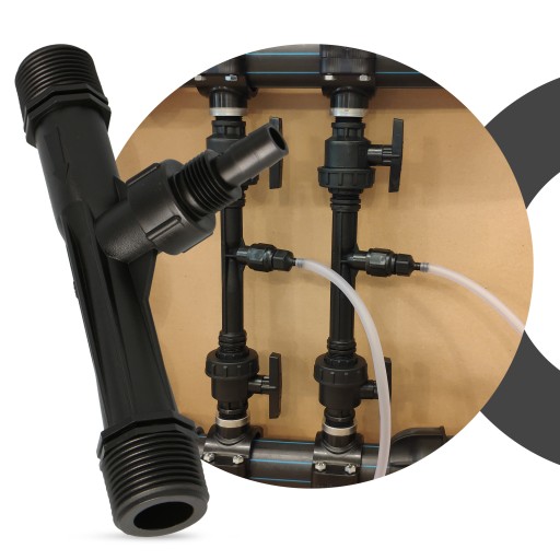 Inżektor to prosty element służący do pobierania płynnego nawozu do instalacji nawadniającej. Działanie tego elementu opiera się na różnicy ciśnień, jaka powstaje pomiędzy wlotem i wylotem w momencie przepływu wody. Powstała siła ssąca przekłada się na pobór nawozu przez otwór znajdujący się pośrodku wtryskiwacza w miejscu zwężki.